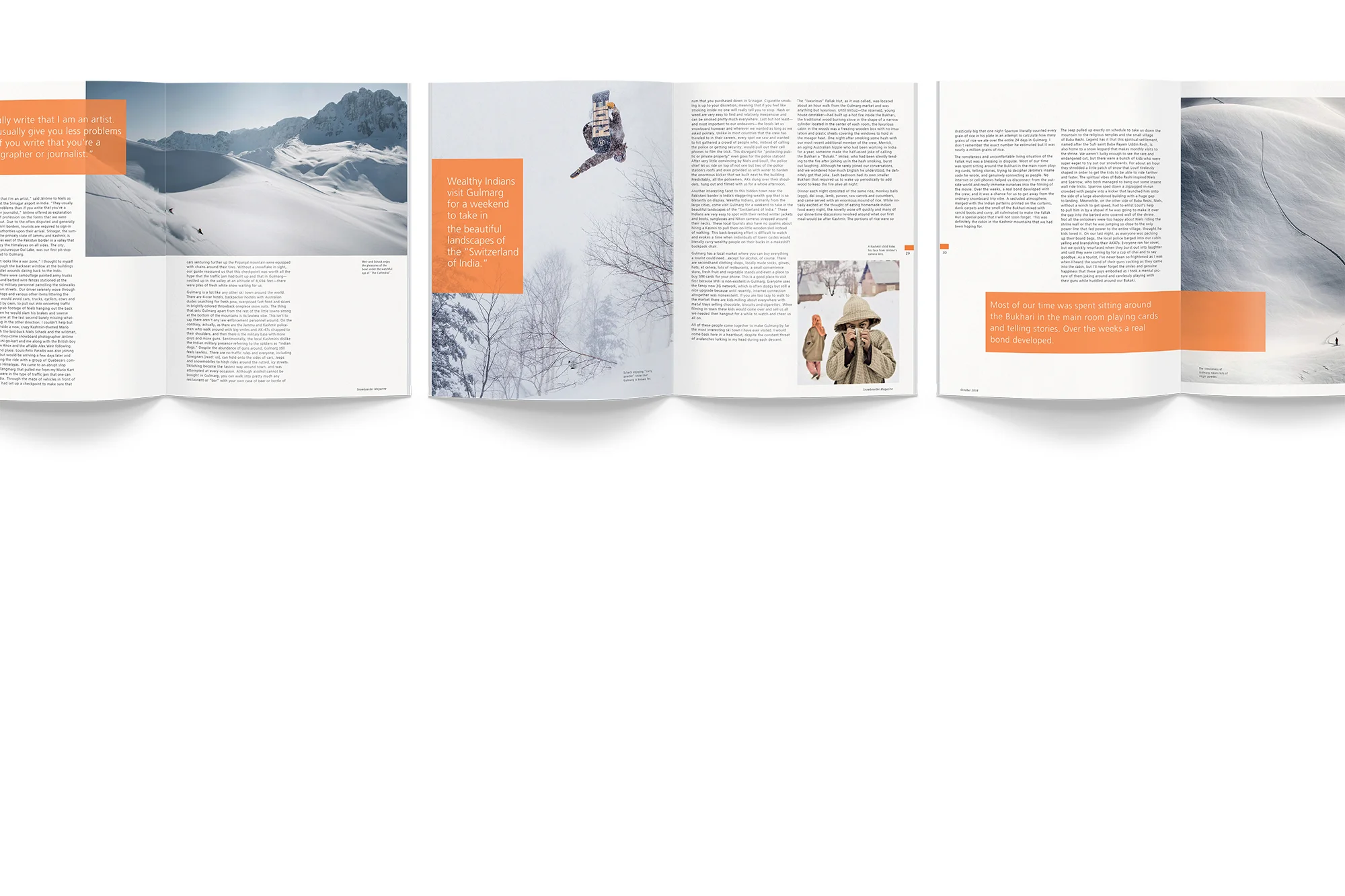 CONCEPT Started in 1987, Snowboarder Magazine is the self-proclaimed most-read magazine on snowboarding. Its lean staff runs a website that is updated regularly while publishing a print magazine 5 times a year. Its style is essentially Thrasher for snowboarders—spreads that rely heavily on amateur photography, and typography that is poorly managed to the point of being, at times, illegible. The objective of the rebrand was for Snowboarder Magazine to move into the broader mid-range snow sports magazine market. The redesign required streamlining and updating the design, while maintaining some of the personality of the current magazine, in order to compete with the bigger snow sports magazines, like Transworld, that are currently dominant in the mid-range snow sports magazine market.